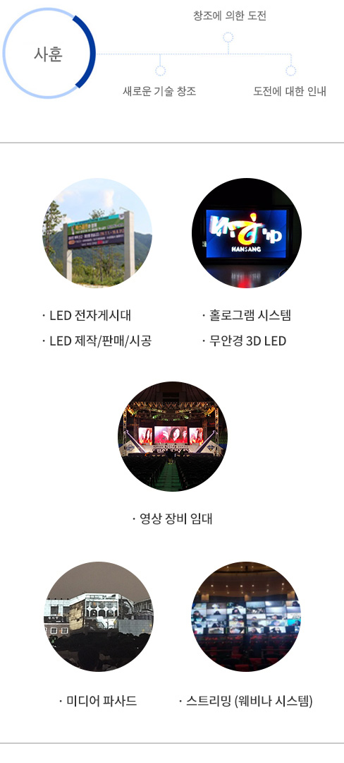 창의적인 비즈니스 파트너 항상 저희 (주) 에이테크미디어에 사랑과 관심을 가져주시는 고객여러분께 감사드립니다. 2011년 다단 LED 전자현수막 특허 / 2014년 다시점 무안경 3D LED 특허 / 2016년 홀로그램 영상출력장치 특허를 획득하였습니다. 이러한 영상기술의 know-how를 바탕으로 무안경 3D / 홀로그램 / 증강현실등을 융합한 새로운 미디어 개발과 미디어파사드 시스템과 영상 콘텐츠 제작사업에도 열심히 노력하여 고객님의 홍보에 큰 도움을 드리고 있습니다. 지난 수년간의 노력과 시행착오를 통해 저희 기업은 고객님들과 더불어 성장하였습니다. 고객님들의 소리에 늘 귀를 기울이며 고객님들의 행복과 만족을 추구하는 기업이 되도록 노력해 온 결과 저희 에이테크가 이 만큼 성장할 수 있었습니다. 앞으로도 에이테크는 고객에게 최고의 가치를 제공할 것을 약속드리며 더 나아가 세계적인 기업으로 성장할 것임을 약속드립니다. 감사합니다. (주) 에이테크미디어 임직원 일동 |