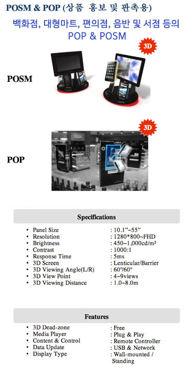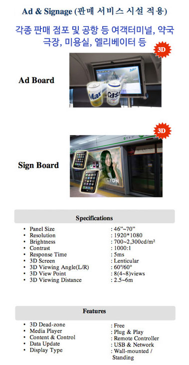 무안경 3D DID Digital Information 3D Display의 약자로 디지털 정보기기의 발달과 더불어 디지털 사이니지는 기업홍보, 상품광고, 공공기관의 정보제공 등 다양한 멀티미디어 컨텐츠를 네트워크를 통해 시간과 장소에 구애 받지 않고 전달할 수 있는 차세대 커뮤니케이션 툴로써 마켓, 기업, 관공서, 금융, 유통, 공공장소 등 새로운 "BLUE Ocean" 시장으로 부각되고 있습니다. 이에 입체영상의 생동감과 임펙트를 이용한 강력한 STOPPING POWER와 광고 사이사이 시선을 유도할 수 있는 힐링용 디지털 입체 수족관 영상을 삽입하여 광고 효과를 보다 극대화 할 수 있는 차세대 3차원 멀티미디어 광고 기술입니다. ![]()